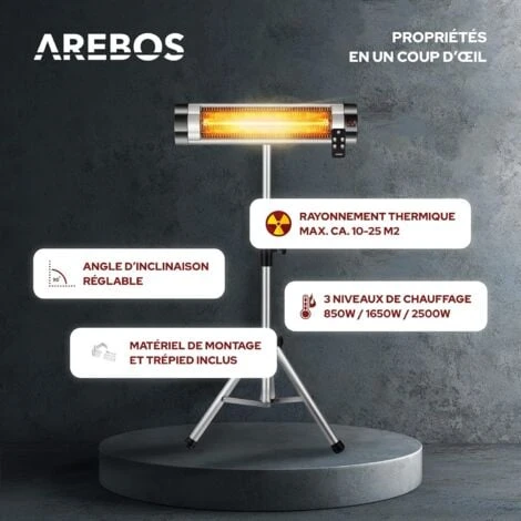 Avec une puissance de chauffe de 2500W, cet appareil de chauffage est très puissant. La technologie infrarouge rend cet appareil de chauffage radiant d’AREBOS extrêmement efficace : la chaleur ne rayonne pas dans l’air ambiant, mais vers les personnes se trouvant à proximité.