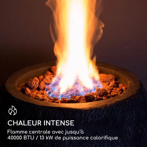 Romantisme pur et belle chaleur : le brûleur en acier au centre de la vasque remplie de pierres de lave chauffe vraiment avec une puissance thermique allant jusqu’à 40.000 BTU (13 kW). Vous pouvez ainsi profiter pleinement des soirées, même fraîches, dans le jardin ou sur la terrasse, tout en ressentant une chaleur très naturelle. Vous pouvez allumer le chauffage à gaz Andros de blumfeldt avec du gaz butane ou du gaz propane. Pour cela, nous vous recommandons une bouteille de gaz standard de 4,5 à 15 kg, que vous pouvez placer à proximité et que vous pouvez raccorder très facilement à vptre foyer grâce au long tuyau équipé d’un détendeur. Le tableau de bord avant vous permet de tout régler facilement, l’allumage électronique et l’arrêt automatique vous offrent une grande sécurité.