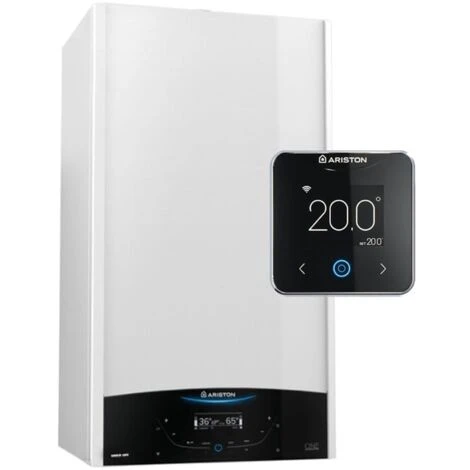 Chaudière à condensation étanche Ariston GENUS ONE NET 24, avec Wi-Fi intégré et contrôle vocal. Classe d’énergie de chauffage A, classe d’eau sanitaire A, profil XL.