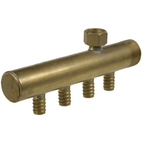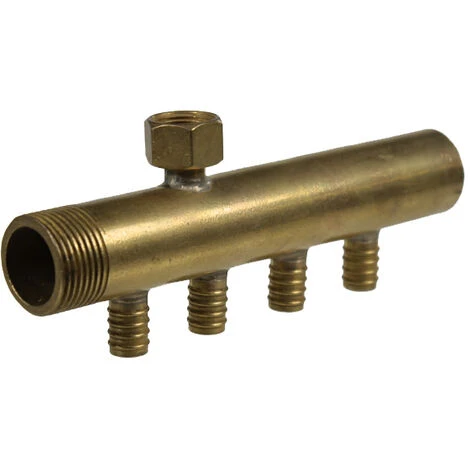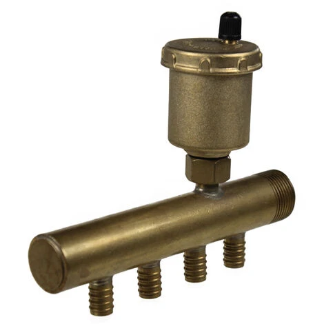 Collecteur chauffage avec purgeur, livré avec ses bagues, permettant de sertir votre tube PER facilement grâce à une pince à glissement. Fabrication française par Anjou Connectique dans nos ateliers du Mans.