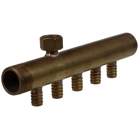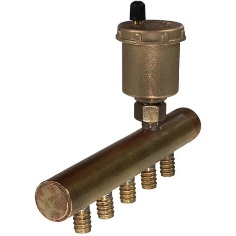 Collecteur chauffage avec purgeur, livré avec ses bagues, permettant de sertir votre tube PER facilement grâce à une pince à glissement. Fabrication française par Anjou Connectique dans nos ateliers du Mans.
