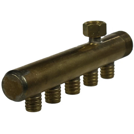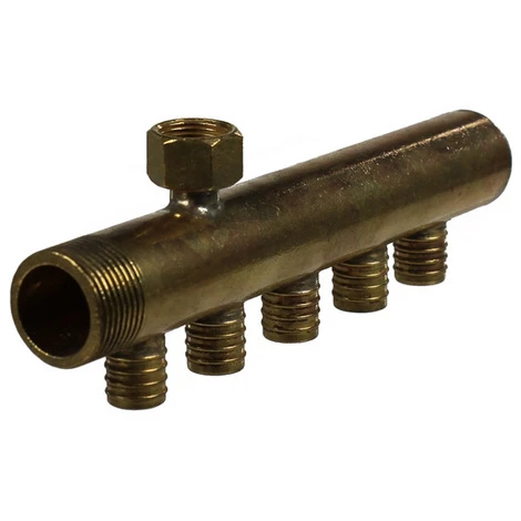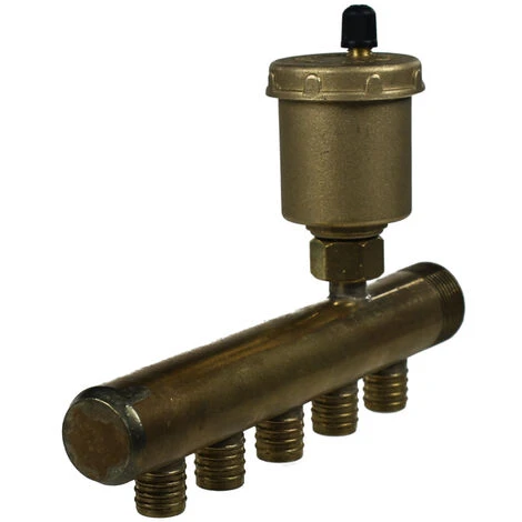 Collecteur chauffage avec purgeur, livré avec ses bagues, permettant de sertir votre tube PER facilement grâce à une pince à glissement. Fabrication française par Anjou Connectique dans nos ateliers du Mans.