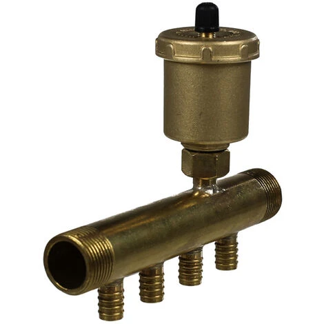 Collecteur chauffage avec purgeur pour tube PER à sertir par glissement. Fabrication française par Anjou Connectique dans nos ateliers du Mans.