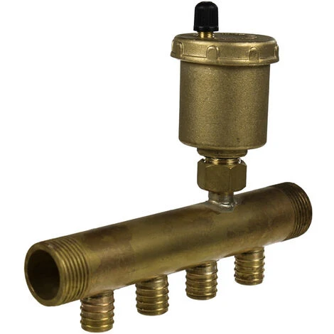Collecteur chauffage avec purgeur, livré avec ses bagues, permettant de sertir votre tube PER facilement grâce à une pince à glissement. Fabrication française par Anjou Connectique dans nos ateliers du Mans.