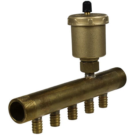 Collecteur chauffage avec purgeur pour tube PER à sertir par glissement. Fabrication française par Anjou Connectique dans nos ateliers du Mans.