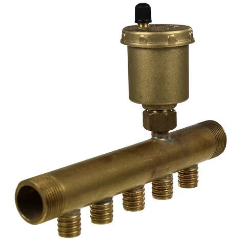 Collecteur chauffage avec purgeur, livré avec ses bagues, permettant de sertir votre tube PER facilement grâce à une pince à glissement. Fabrication française par Anjou Connectique dans nos ateliers du Mans.