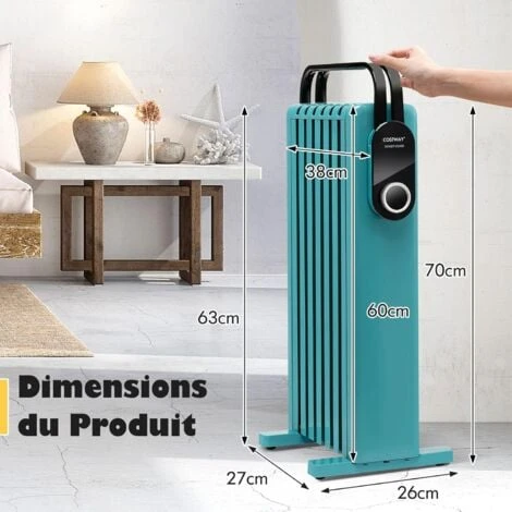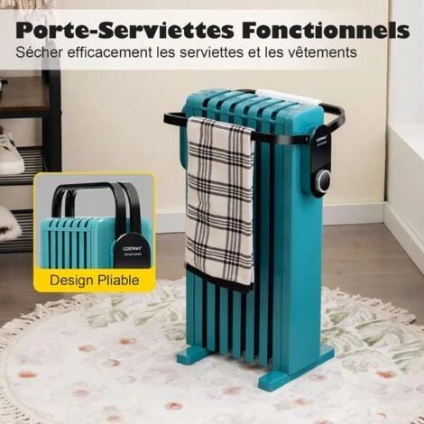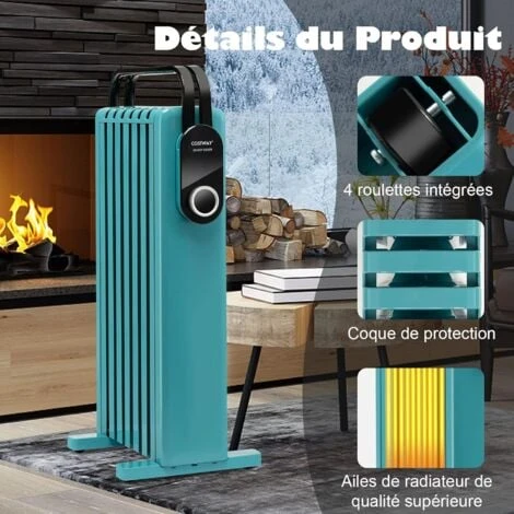 - Avec des réglages de chaleur à 3 niveaux, ce radiateur satisfait vos différentes demandes avec une efficacité de chauffage élevée. Le radiateur est conçu avec plusieurs détails humanisés. Vous pouvez sécher des serviettes ou des vêtements sur le support pliable. Les quatre roulettes intégrées rendent le radiateur facile à déplacer dans tous les endroits que vous souhaitez. Et la taille mince du radiateur ne prendra pas trop d’espace, ce qui est idéal pour les petits appartements. Avec ce radiateur rempli d’huile, vous ne vous sentirez plus froid les jours d’hiver!