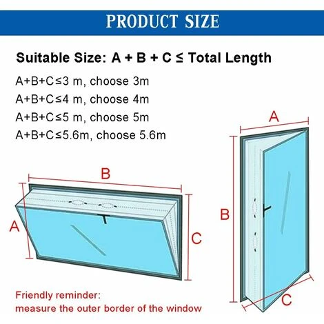 Guide d’achat des tailles : veuillez vous référer à l’image pour mesurer les longueurs des trois côtés des fenêtres A, B et C pour les additionner, A+B+. C=3.5~4 mètres, choisissez 4m,
