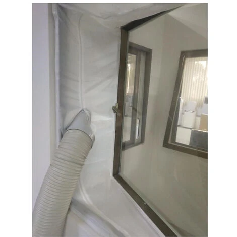 Joint de fenêtre en tissu blanc avec ouverture/fermeture à glissière, pouvant accueillir le tuyau d’échappement de votre climatiseur amovible. Il empêche l’air chaud, l’humidité et les insectes de rentrer dans la pièce.