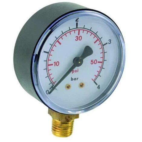 Ce manomètre se raccorde verticalement par un raccord bronze en 1/4′ situé sur le cadran plastique. Gamme de mesure : 0 à 4 bars. Température de fonctionnement : -20°/+80°. L’élément sensible est en cuivre. Diamètre : 63. Classe de précision : 2,5 %. Protection : IP43. Boîtier et cadran en plastique. On l’appelle aussi : capteur de pression, sonde ou vacuomètre