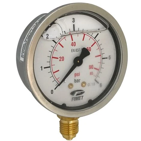 | Manomètre glycériné grande précision, filetage radial (sur le coté) en 8×13. Diamètre 63mm, graduation jusqu’à 6 bars. |