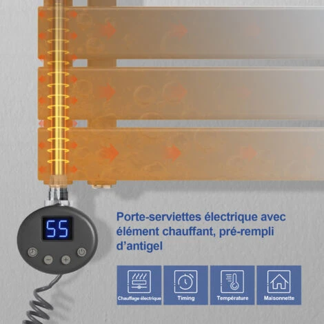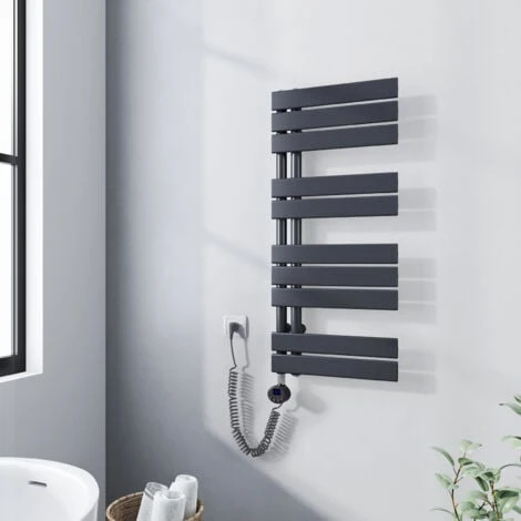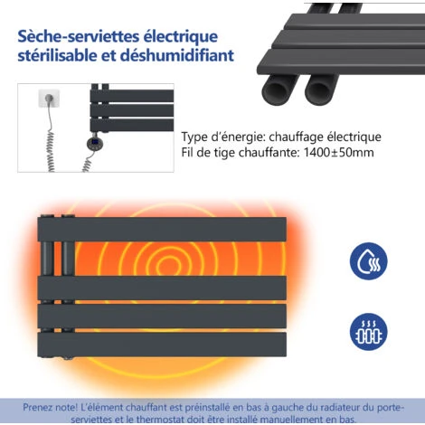 Meykoers Sèche-serviette électrique 899x400mm Anthracite Radiateur sèche-Serviettes Avec 400W élément chauffant – Lames plates ouverture laterale