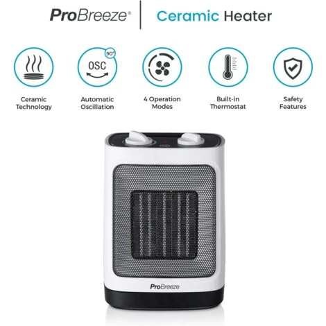Ce mini radiateur céramique 2000 W de Pro Breeze utilise des disques chauffants en céramique pour permettre le transfert d’une chaleur très élevée dans les petits espaces. Le chauffage céramique est la technologie la plus récente qui permet aux radiateurs d’appoint de chauffer plus vite, tout en assurant une sécurité supérieure et en consommant moins d’énergie que les radiateurs soufflants traditionnels. Appuyez sur l’interrupteur et le radiateur soufflant céramique pivotera d’un côté à l’autre.