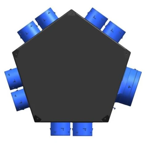 Ce plénum dispose de 8 piquages sanitares, 1 piquage cuisine, 1 piquage d’entrée en ø125, 1 piquage d’ entrée en ø150/160 et d’une plaque d’obturation équipée de deux bouchons de ø80mm.