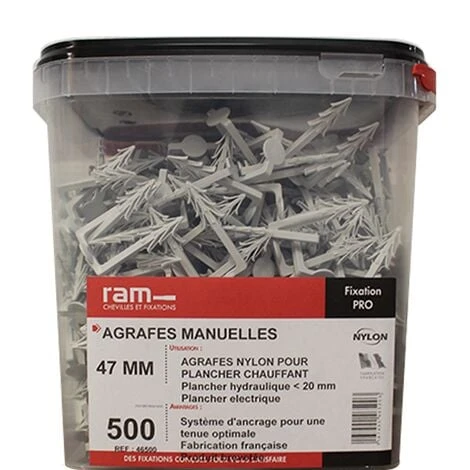 Distance recommandée entre deux agrafes : maxi 500 mm (DTU 65.14). Agrafes à poser manuellement sans agrafeuse.
