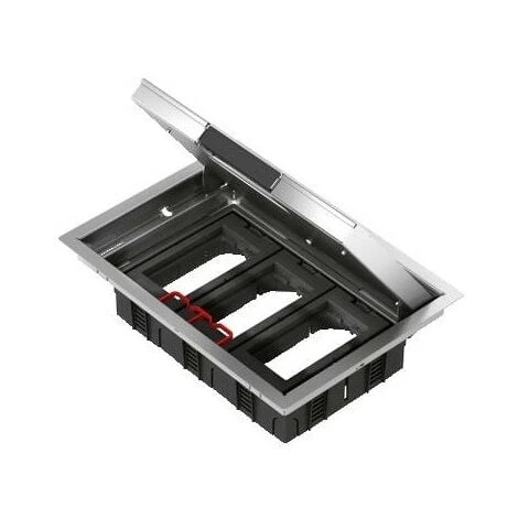OptiLine 45 boîte de sol métal 6 postes 45x45mm plancher &, dalle béton SCHNEIDER ISM51636 Composition :_ un cadre équipé de 4 griffes de fi xation rapide_ un couvercle avec une réservation pour une garniture jusqu’à 6 mm d’épaisseur (garniture nonfournie)_ supports d’appareillage pour mécanismes au format 45 x 45 mm (Altira u page C38)_ un guide de sortie de câbles_ serre-câbles_ cloisons de séparation courant fort / courant faible_ un gabarit de perçage@ degré de protection : IP 20@ matériau : PA6 avec 30 % de billes de verre ou métal, acier, PC + ABS@ couleur : gris@ conformes aux normes IEC 1084-1, IEC 1084-2-4, SS 424 10 32: 1989 et certifi cations73/23/EEC et 93/68/EEC
