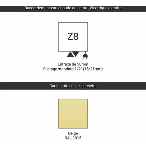 – Mariez la couleur beige de votre sèche-serviette avec des meubles traditionnels et équipements blancs ou chrome.
