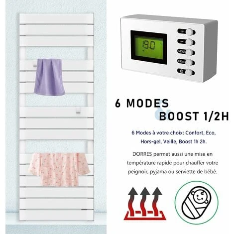 Programmation simplifié avec télécommande : Avec écran LCD, thermostat précis, boîtier de commande télécommande (distance max. 3-5m), DORRES vous permet une programmation hebdomadaire personnalisable pour réguler la température selon vos besoins (6 modes : Confort, Eco, Hors-gel, Veille, Boost 1h, 2h). Programmez (7 jours); Réglage de la température : 5-29°C, Précision : 0.5°C; Plus besoin de reprogrammer tous les jours, une touche et c’est parti!