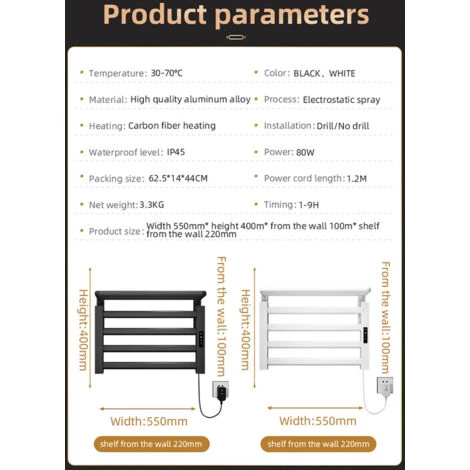 - ★ Chauffe-serviettes : le chauffe-serviettes est fabriqué en alliage d’aluminium durable, facile à nettoyer et sans se soucier des problèmes de rouille. L’utilisation d’un chauffe-serviettes peut raccourcir l’état humide de la serviette, éviter efficacement les odeurs, réduire le nombre de nettoyages de serviettes, augmenter la durée de vie de la serviette et vous apporter un environnement de vie sain et hygiénique.