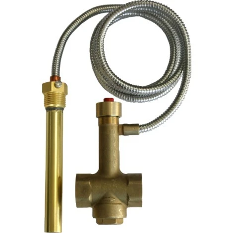 Obligatoire en circuit fermé sous pression, la soupape thermique détecte une température anormalement élevée (environ 95°C) et injecte de l’eau froide pour refroidir la chaudière bois ou granulés. Soit dans un serpentin si la chaudière en possède un (soupape thermique 1 voie), soit directement sur le circuit retour de la chaudière (soupape thermique double, 2 voies).