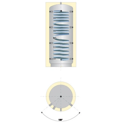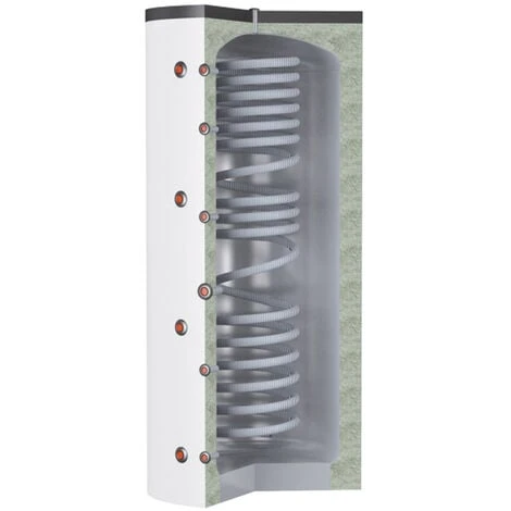 Revêtement extérieur : skaï gris Prise prévue pour appoint électrique 1 serpentin en inox 316L pour la production d’ECS.4×2 piquages principaux 5 piquages pour sondes, thermometres Déflecteurs à labyrinthe pour une excellente stratification