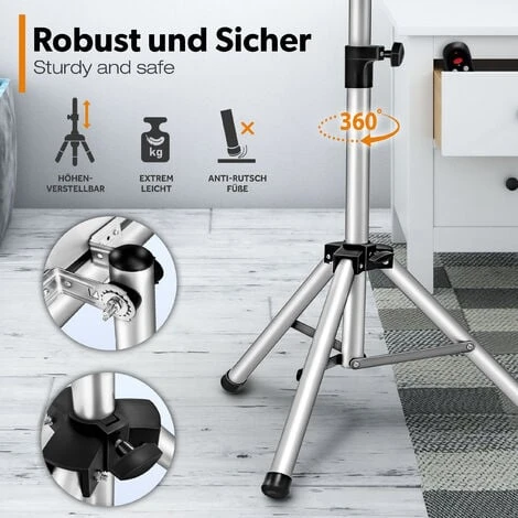 Le trépied en aluminium avec pieds antidérapants est réglable en hauteur de 110 à 180 cm et peut être tourné à 360°. Le support mural fourni avec ce radiateur à quartz permet de le monter sur n’importe quel mur.